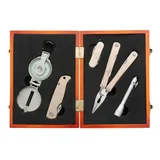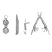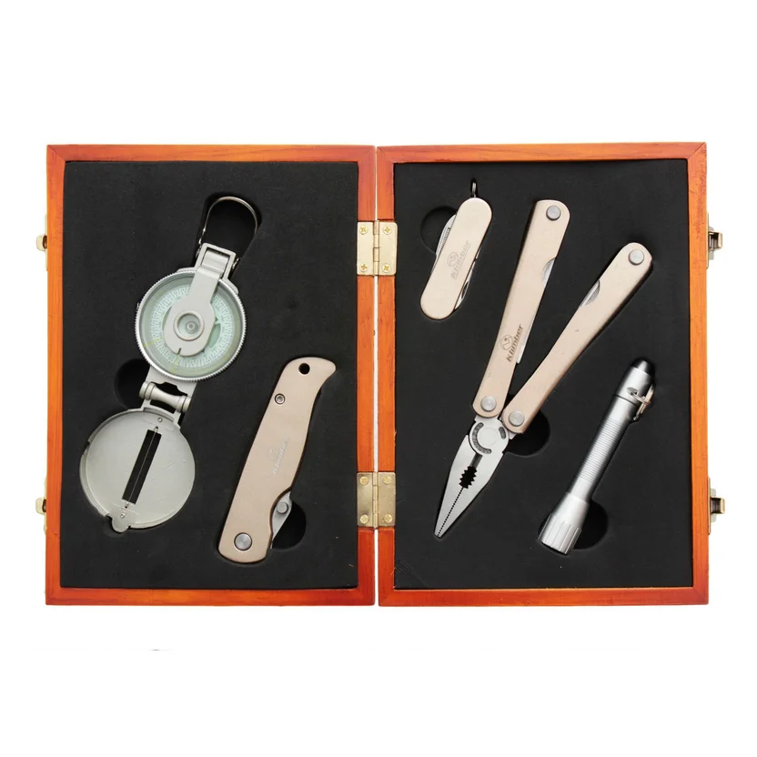 Incluye alicate,linterna,cortapluma,mini cortapluma,brújula y estuche