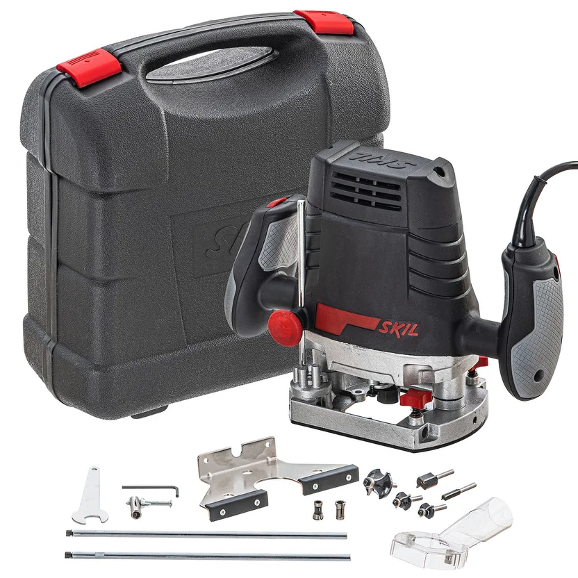Maletín plástico con 6 fresas | 3 pinzas (6mm 8mm y 1/4) | adaptador para aspiración de polvo | guía paralela | guía circular | guía para copiar | llave para recambio