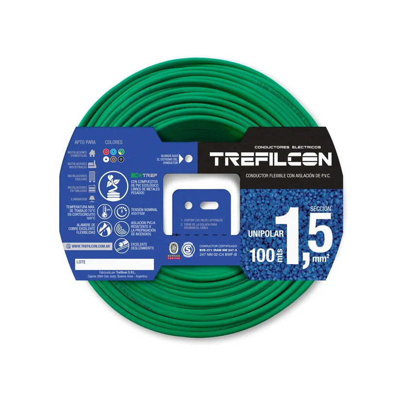 Este cable unipolar, fabricado con PVC/CU, es de color verde y amarillo, y cuenta con un voltaje de 450/750 V. Su uso es recomendado para instalaciones fijas, y es de la marca Trefilcon. El cable tiene un calibre de 1.5 mm2 y es de origen argentino.