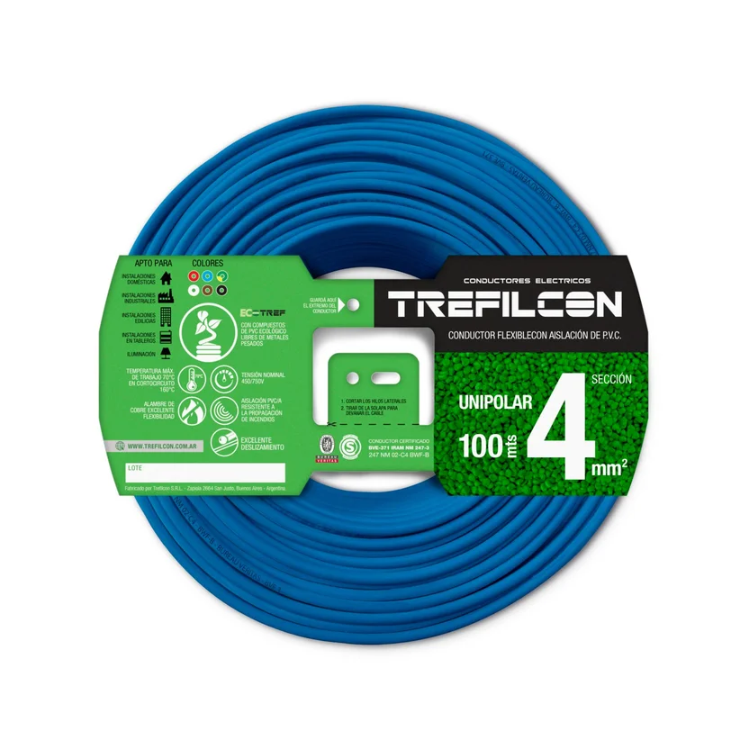 ¡Iluminá tus espacios con el Cable unipolar 4 mm2 celeste por metro! Este cable de color celeste, fabricado en Argentina, es ideal para instalaciones fijas. Con una longitud de 1 metro y un calibre de 4 mm2, este cable Trefilcon te brindará la seguridad y calidad que necesitás.