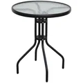 Dale un toque industrial a tu patio con esta mesa redonda de vidrio templado. Su diseño simple y elegante la convierte en la opción perfecta para disfrutar de un café al aire libre o una comida con amigos. Con un diámetro de 60 cm, es ideal para dos personas y su estructura de metal negro le da un toque moderno a cualquier espacio.