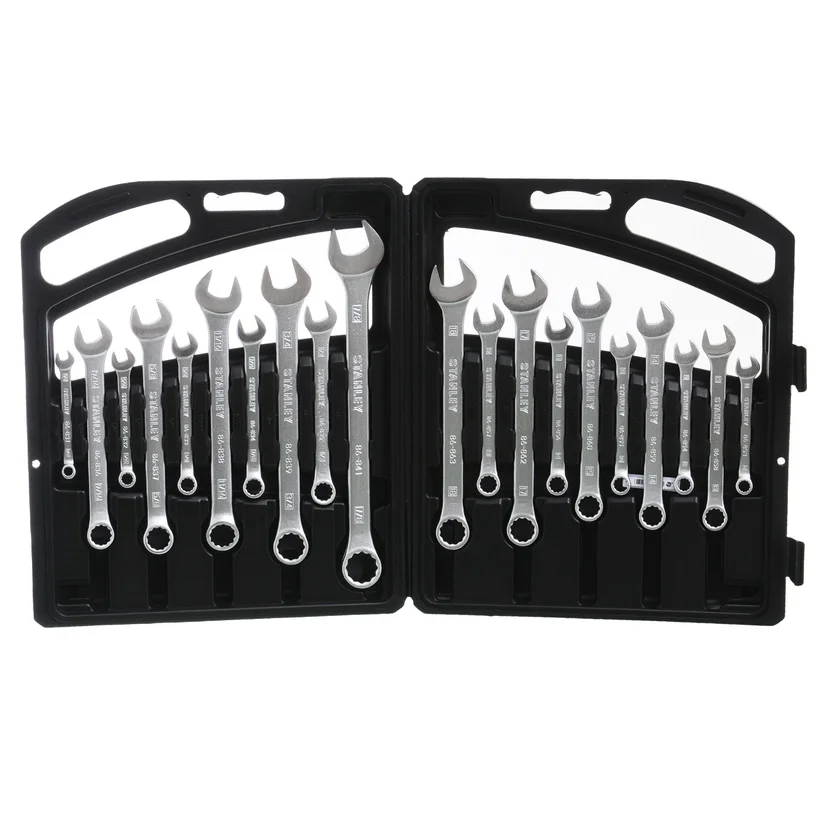 El Kit de llaves combinadas 20 piezas de Stanley está fabricado con acero al cromo vanadio de alta calidad, lo que le da una gran resistencia y durabilidad. Su acabado mate le da un aspecto profesional y elegante. El kit incluye llaves de diferentes tamaños, tanto en pulgadas como en milímetros, lo que te permitirá trabajar con una variedad de tuercas y tornillos. Además, las llaves combinadas te permiten trabajar con tuercas y tornillos de diferentes formas, lo que las convierte en una herramienta versátil para cualquier taller o caja de herramientas.