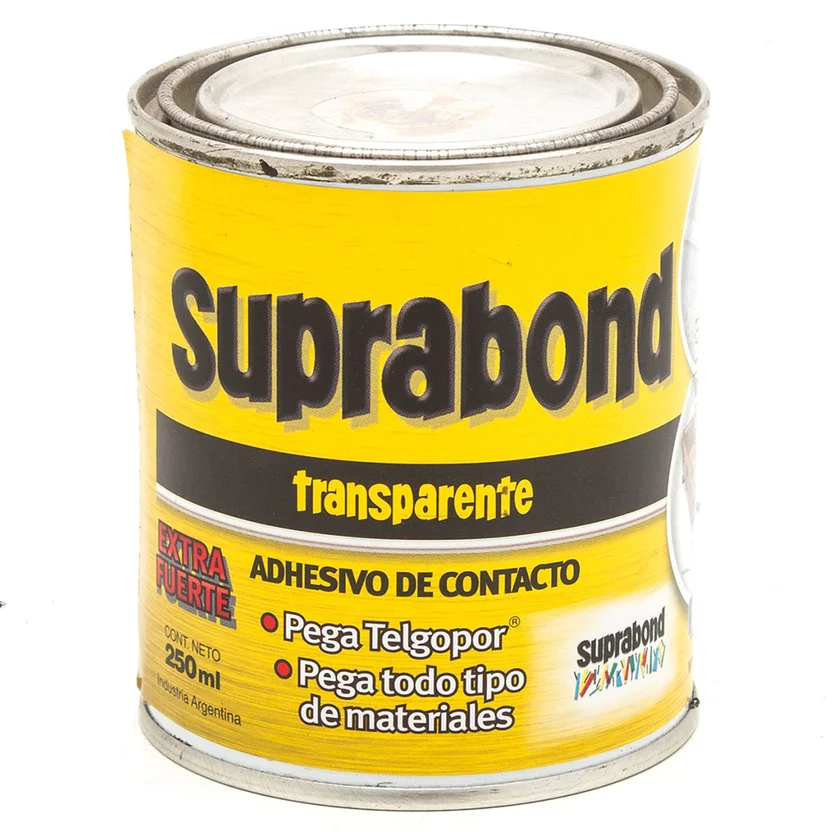 Suprabond es un adhesivo de contacto transparente de 1/4 kg, presentado en una lata. Su secado final es rápido, en pocos minutos, y su uso es multiusos. Es ideal para trabajos que requieren prolijidad, precisión y alto poder de adhesión. Se puede aplicar sobre una gran variedad de superficies, como telgopor, cuero, tela, metal, cartón, vidrio, loza, cerámica, madera, porcelana, corcho, fieltro, goma, suela, PVC rígido, ABS, etc.