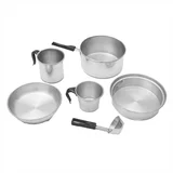 8 piezas: una cacerola n° 16 + un sartén-plato n° 16 + un plato mochilero + un jarro n° 8 + un jarro n° 9 + un cucharón + un mango + un bolso contenedor.