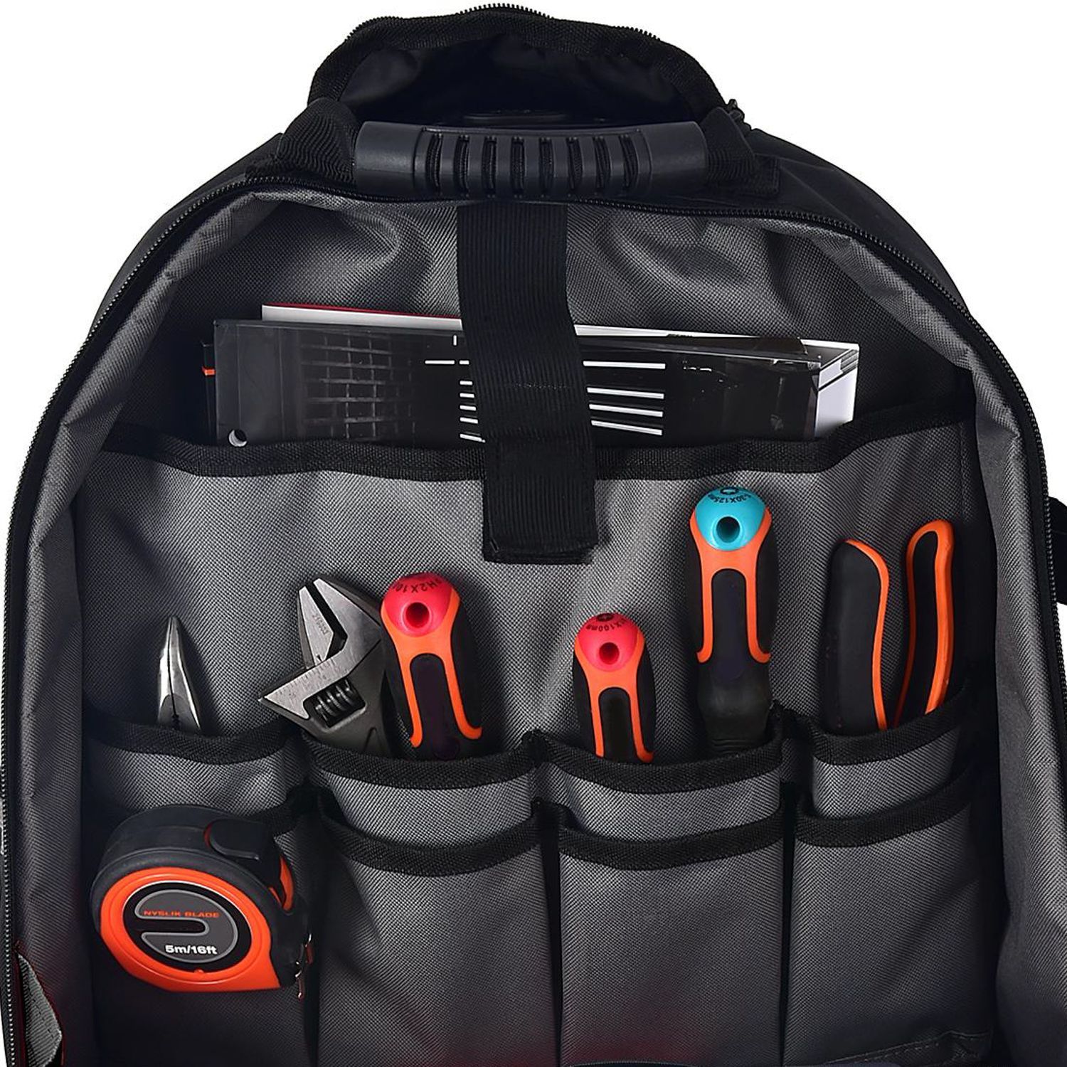 Esta mochila está fabricada en poliéster, lo que garantiza su durabilidad. Cuenta con manillas para facilitar su transporte y un práctico tipo de cierre de cremallera para asegurar tus herramientas. Sus dimensiones empacadas son de 20 cm de alto, 50 cm de largo y 39 cm de ancho. Incluye compartimentos para mantener todo en orden.