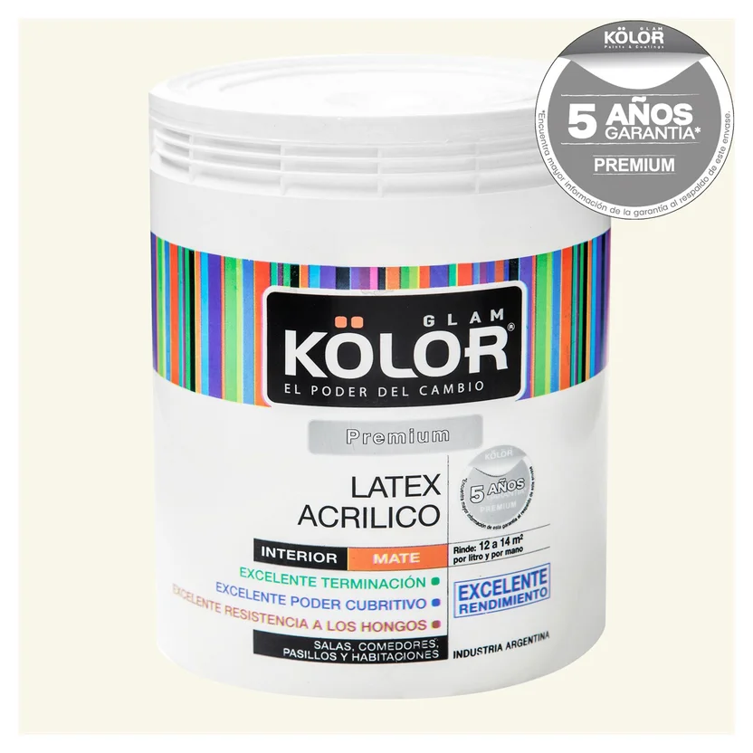 Esta pintura de base al agua, de la marca Kölor, es ideal para aplicar en interiores, especialmente en paredes. Ofrece un rendimiento de 10 m2 por litro por capa, lo que te permite cubrir una buena superficie con cada litro. Además, su tiempo de espera para la segunda mano es de solo 4 horas, lo que agiliza el proceso de pintado. Cuenta con una garantía de 5 años.