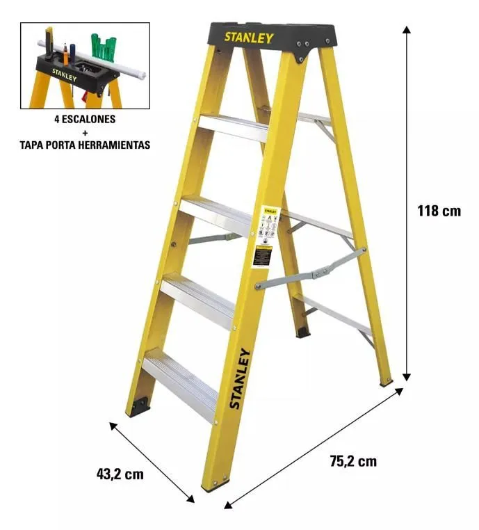 ¡Subite a la seguridad y eficiencia con la Escalera tijera dieléctrica de fibra de vidrio de 4 escalones! Ideal para trabajos profesionales, esta escalera Stanley te ofrece la altura máxima de 125 cm que necesitas para llegar a donde quieras. Su diseño en color amarillo te dará visibilidad y estilo.