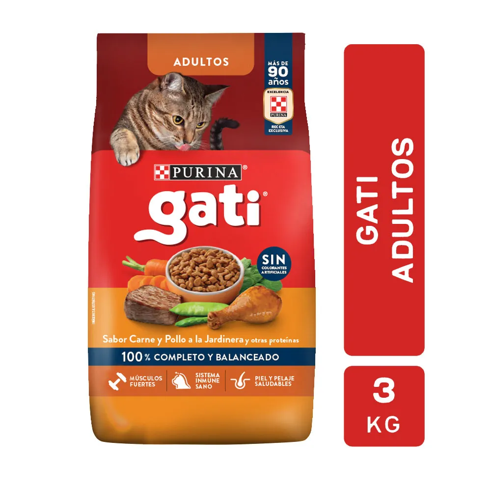 ¡Dale a tu gato adulto el sabor que ama con Alimento Gati! Este alimento seco de 3 kg, con sabor a carne y pollo, es perfecto para mantener a tu felino feliz y saludable. ¡Tu gato te lo agradecerá!