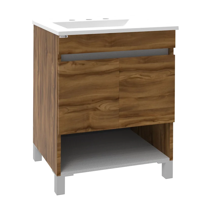 El Vanitory de apoyo Silver 60 cm 3 agujeros nogal está fabricado con melamina de alta calidad, lo que le otorga resistencia y durabilidad. Su diseño incluye un lavamanos de Silton, que le da un toque de sofisticación a tu baño. Además, cuenta con un sistema de cierre suave en las puertas, lo que te permite abrir y cerrar las mismas sin ruidos molestos. El vanitory se entrega sin armar, pero su armado es sencillo y rápido.