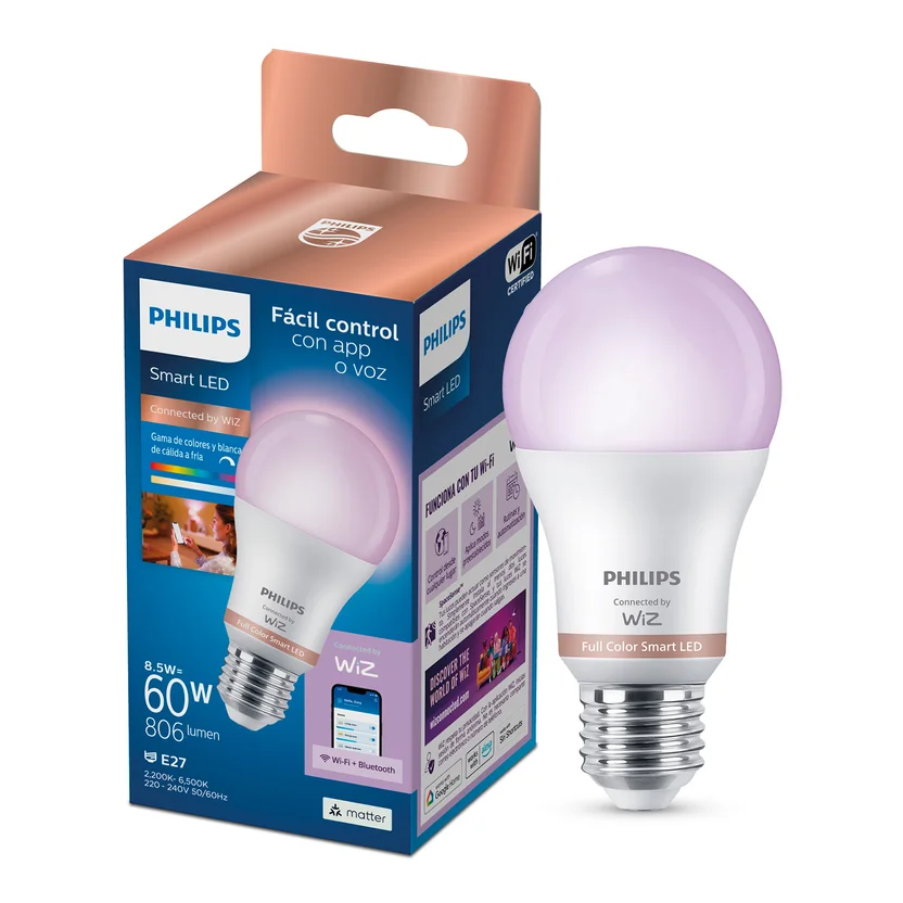 Dale un toque de color inteligente a tu hogar con la Lámpara Smart Philips Wiz. Con su diseño A60 y un flujo luminoso de 806 lúmenes, esta lámpara te ofrece una iluminación brillante y adaptable a cualquier ambiente. Controla la intensidad y el color de la luz desde tu smartphone, creando la atmósfera perfecta para cada momento. ¡Fácil de instalar y usar!