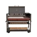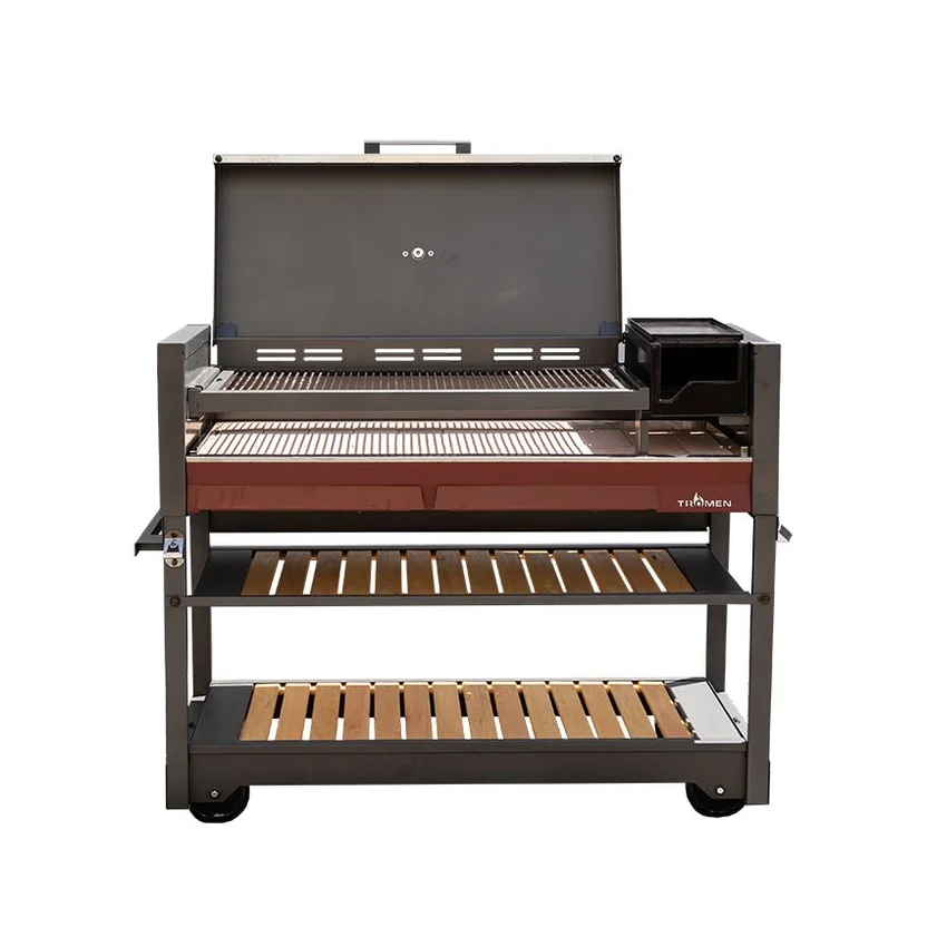 Parrilla doble altura con ladrillo refractario | Fogón con modulo de plancha | Estantes de madera | Cajón calentador | Tabla de madera y destapador | Base con ruedas
