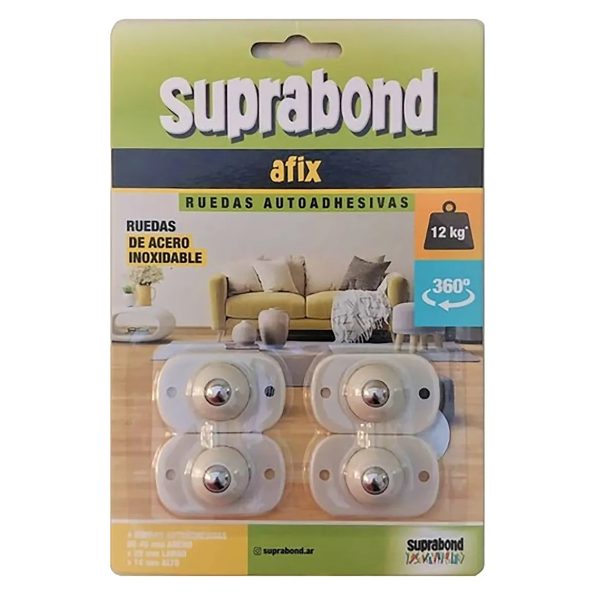 Estas ruedas autoadhesivas, fabricadas en ABS y acero inoxidable, son de origen chino y cuentan con una capacidad de carga de 12 kg. Cada paquete incluye 4 unidades, con medidas de 45 mm de ancho, 28 mm de largo y 14 mm de alto. Su superficie de aplicación es versátil, adaptándose a diversas necesidades.