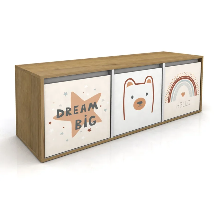 La Cajonera Infantil Arco Iris tiene un ancho de 120 cm, una profundidad de 35 cm y una altura de 45 cm, lo que la hace ideal para espacios pequeños. Sus tres cajones con guías correderas permiten un fácil acceso a los objetos guardados. La cajonera tiene un peso máximo soportado de 45 kg, lo que la hace resistente y segura para el uso diario. Además, incluye herrajes e instructivo de armado para facilitar su montaje.