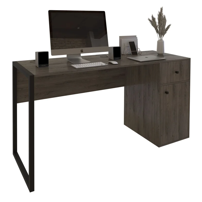 Este escritorio cuenta con un cajón y una puerta, lo que te permite guardar tus documentos y objetos personales de forma ordenada. Su estructura de hierro negro mate de 1.2 de espesor y cuadro de 3 x 3 cm le brinda resistencia y estabilidad. El escritorio tiene un ancho de 150 cm, una profundidad de 55 cm y una altura de 82 cm, lo que lo hace perfecto para espacios de trabajo de tamaño mediano. Además, su fácil armado te permitirá tenerlo listo en poco tiempo.