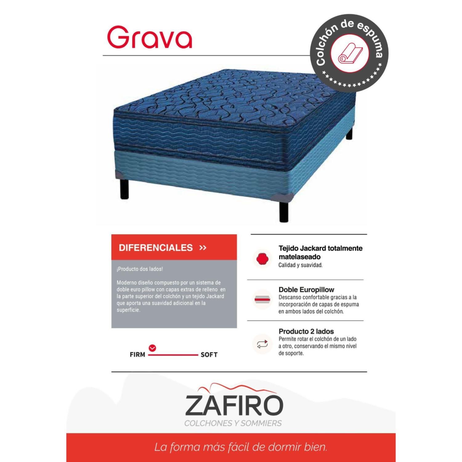 Este colchón Zafiro, modelo Grava, cuenta con un relleno de espuma de alta densidad y un tapiz de tejido Jackard que aporta suavidad. Su firmeza media es ideal para un descanso equilibrado. Además, soporta hasta 100 Kg por plaza y tiene un origen argentino. Incluye un colchón y cuenta con un sistema de doble euro pillow.