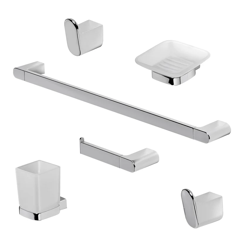 Renová tu baño con el set de accesorios SORIA de 6 piezas, un conjunto clásico y elegante que transformará tu espacio. Este set cromado, fabricado en Zamac, incluye todo lo necesario para darle un toque sofisticado a tu baño.