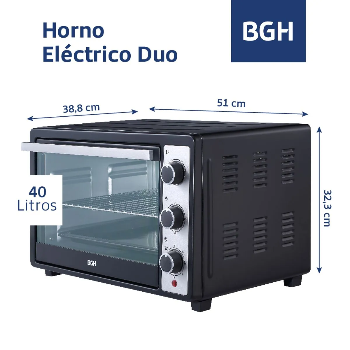 Este horno eléctrico BGH, de origen argentino, funciona con una potencia de 1800 W y tiene un ancho de 55 cm. Incluye parrilla, bandeja recolectora de migas y bandeja para hornear. Además, cuenta con control de temperatura y funciones como termostato y timer.