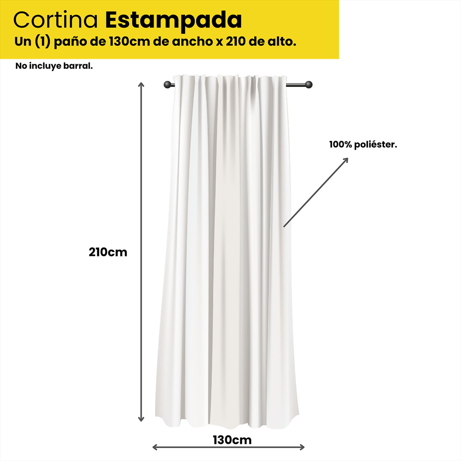 Esta cortina de tela, modelo CLAS0035, está hecha de 100% poliéster, lo que la hace lavable en lavarropas y con agua fría. Sus dimensiones son de 130 cm de ancho y 210 cm de alto, ideal para living, comedor o dormitorio. Incluye una unidad y cuenta con una garantía de 12 meses.