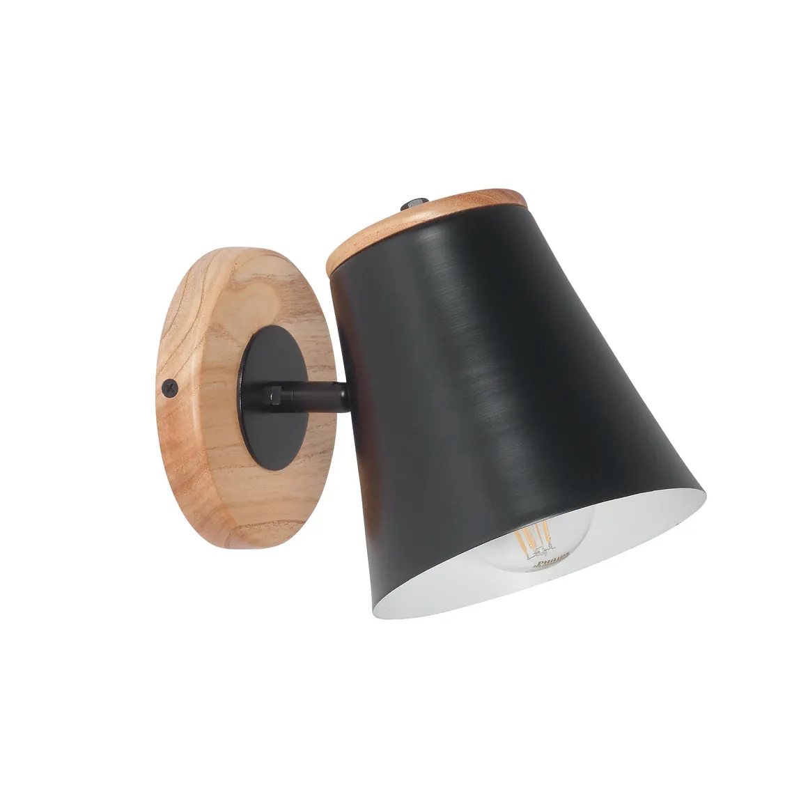 El Aplique Kona cuenta con una rosca E27 y está fabricado con madera y metal. Su diseño incluye una campana y detalles en metal negro, lo que le da un aspecto sofisticado. Funciona con un voltaje de 220 V y tiene una potencia máxima de 12 W. El largo del cable es de 30 cm.