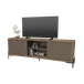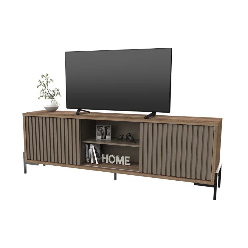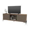 Rack varillado 2 puertas corredizas y un estante. Patas de hierro con pintura epoxi. Para TV de 65 pulgadas. Fabricado con varillas de 15 x 25 mm en MDF, placa MDP en 15 y 25 mm de espesor. Melamina texturada de alta calidad
