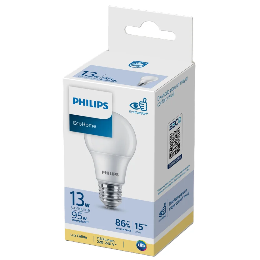 Iluminá tus espacios con la Lámpara LED ECO de 13 W con luz cálida E27 de Philips. Esta lámpara es perfecta para crear un ambiente relajante y acogedor en cualquier habitación. Con su diseño moderno y eficiente, es la opción ideal para reemplazar tus antiguas bombillas incandescentes y ahorrar energía.