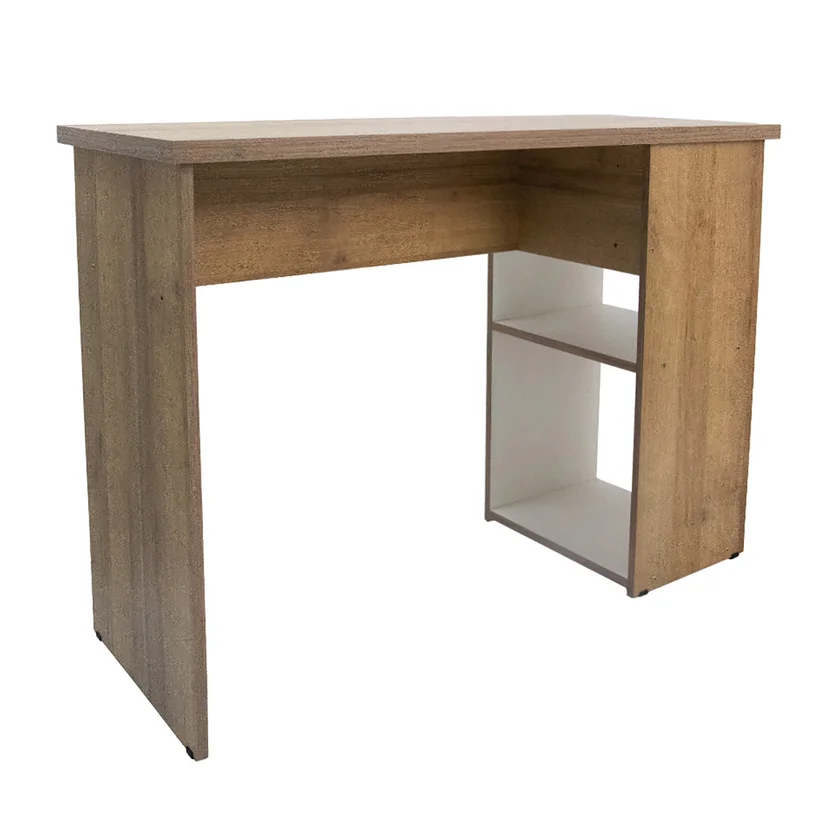 Este escritorio rectangular de 110 cm de ancho y 77 cm de alto, fabricado en melamina, ofrece una superficie resistente y duradera. Su diseño incluye estantes para organizar tus elementos esenciales. El escritorio es de origen argentino y cuenta con una estructura de melamina.