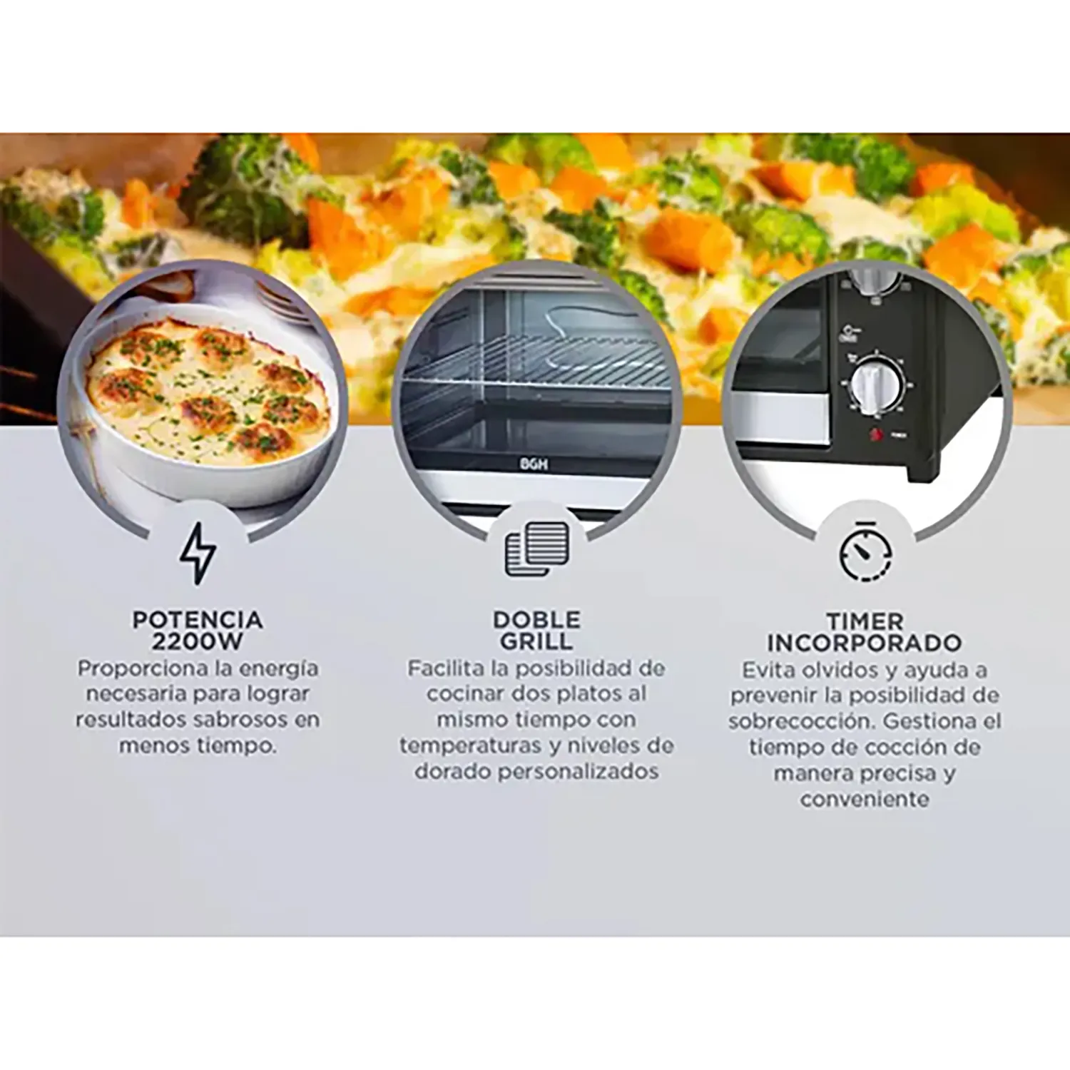 ¡Dale un toque de sabor a tus comidas con el Horno eléctrico BGH BHE65M19N! Con su capacidad de 64 L, este horno de acero inoxidable es perfecto para preparar tus platos favoritos. Cuenta con luz interna y temporizador, lo que te permite controlar la cocción de tus alimentos de manera fácil y precisa.