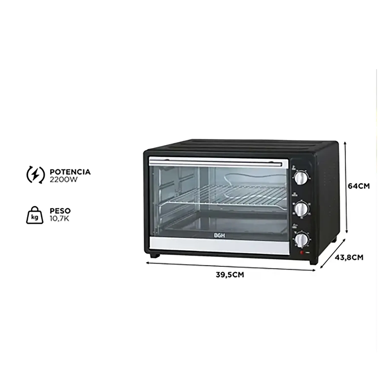 Este horno eléctrico BGH ofrece una alimentación eléctrica y un diseño elegante en color negro. Sus características incluyen un panel manual y una bandeja para facilitar su uso. Con una potencia no especificada, este horno cuenta con un temporizador y luz interna para un control total de la cocción. Sus dimensiones son de 39.5 cm de alto, 64 cm de ancho y 43.8 cm de profundidad.