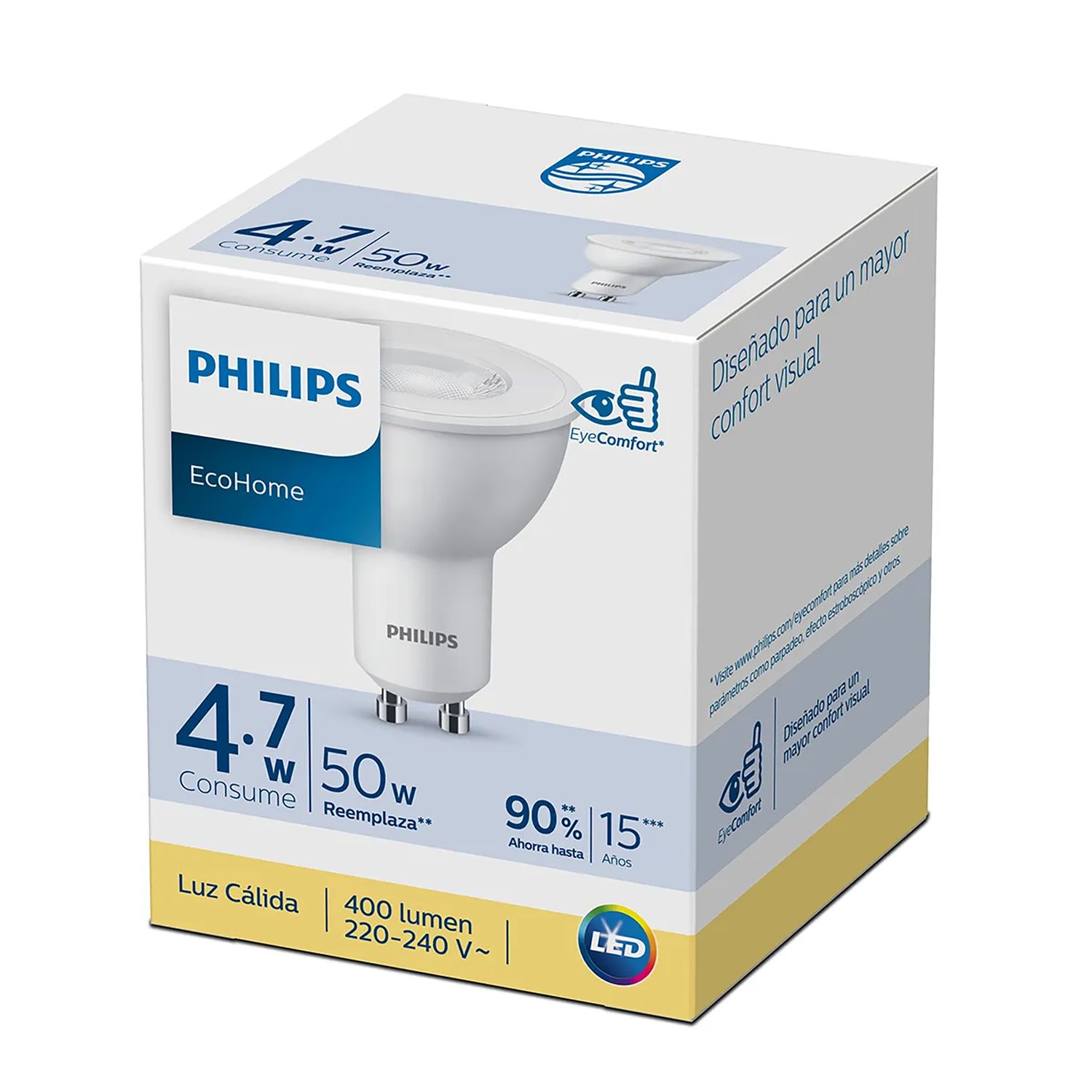 Iluminá tus espacios con el Spot LED GU10 ECO de Philips. Este foco LED de luz cálida, con una potencia de 4.7 W, te ofrece una experiencia visual cómoda y un rendimiento excepcional. ¡Dale un toque moderno a tu hogar!