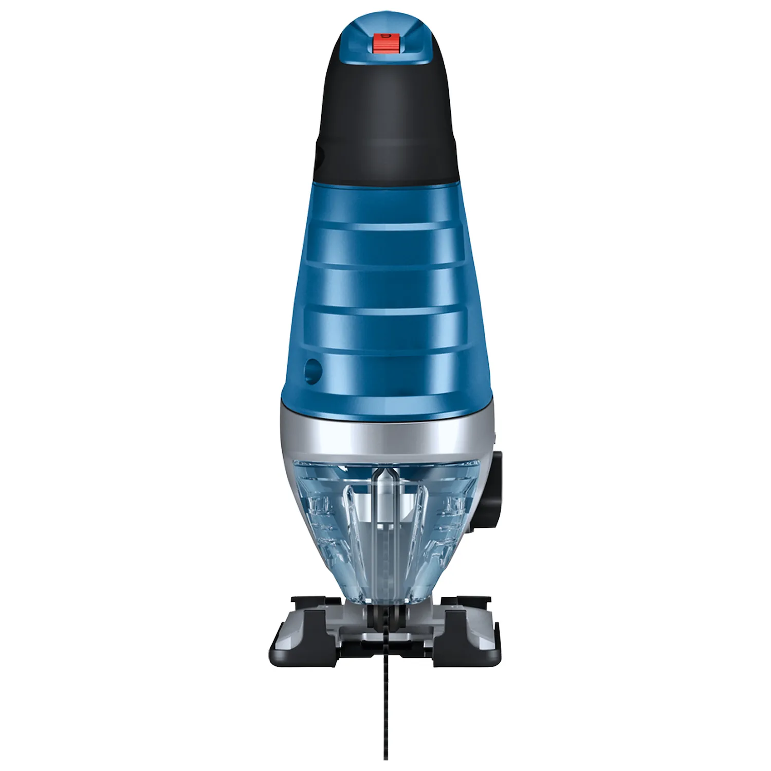 Esta sierra caladora cuenta con 4 niveles de velocidad pendular y hasta 6 niveles de velocidad para adaptarse a diferentes materiales. Su diseño incluye una empuñadura ergonómica con revestimiento de goma y una base robusta de aluminio. Además, ofrece protección contra el polvo y astillas, asegurando cortes limpios y seguros. Con una profundidad máxima de corte de 75 mm en cortes a 45º, es ideal para trabajos profesionales.