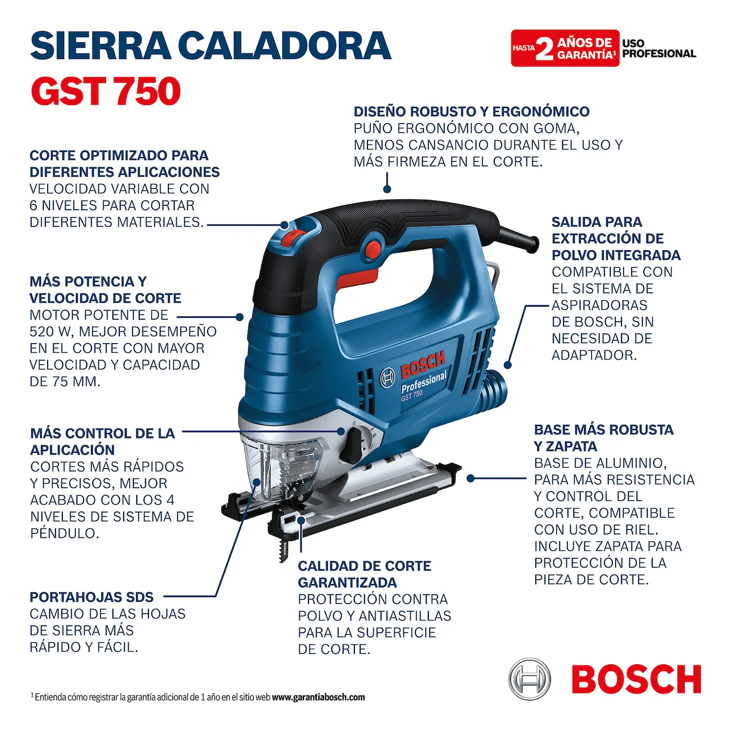 ¡Dale un impulso a tus proyectos con la Sierra caladora eléctrica Bosch GST 750! Con su potente motor de 520 W, esta herramienta te brinda cortes rápidos y precisos en madera, metal y otros materiales. Su diseño ergonómico y robusto, junto con su sistema de péndulo de 4 etapas, te garantizan un acabado refinado y cortes optimizados. ¡Prepárate para experimentar la eficiencia y calidad que necesitas!