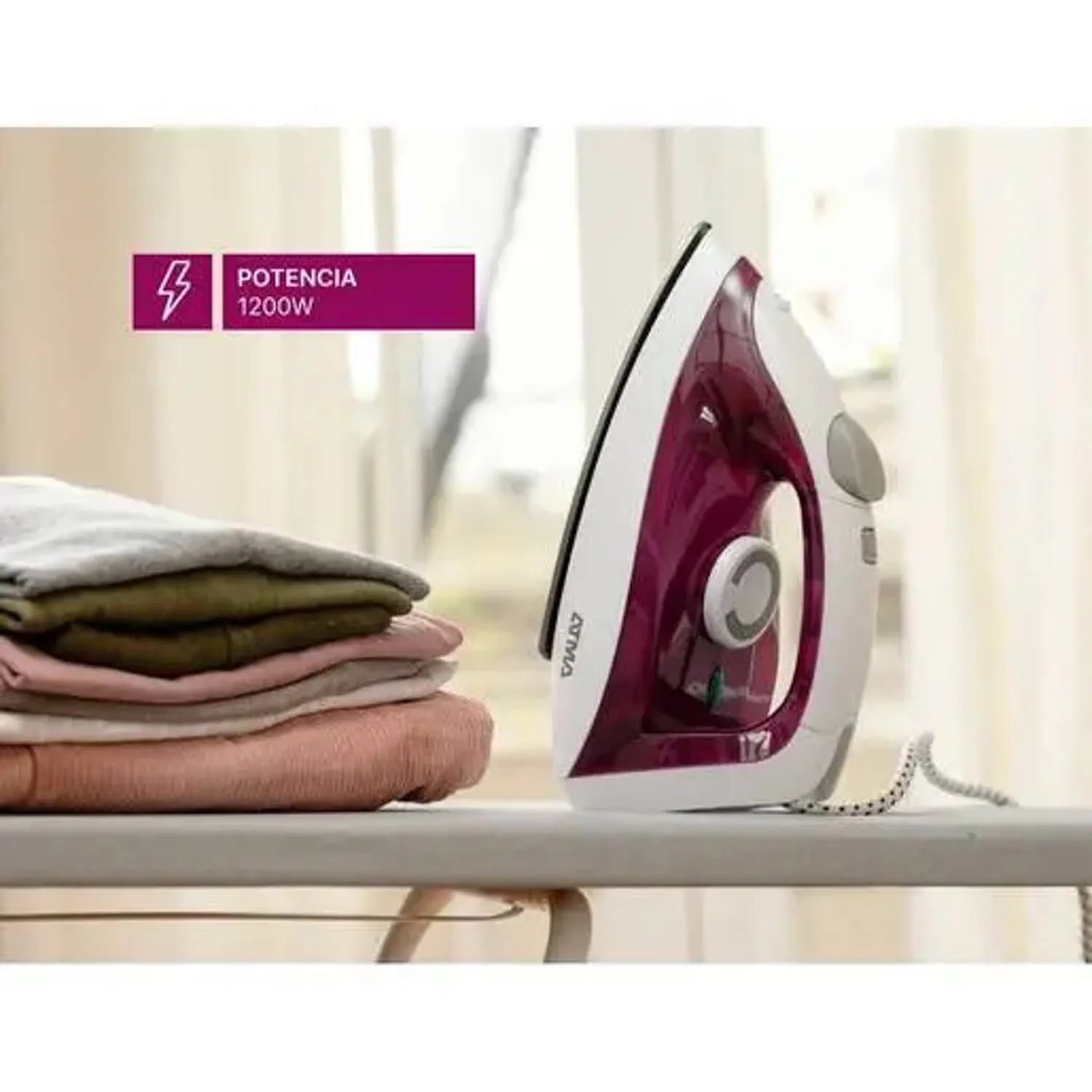 Esta plancha seca Atma cuenta con una base antiadherente que facilita el deslizamiento sobre las prendas, y un control de temperatura para adaptarse a diferentes tipos de tejidos. Con una potencia de 1200 W y un voltaje de 220 V, asegura un planchado eficiente y rápido. Además, su diseño incluye un indicador de encendido para mayor seguridad.