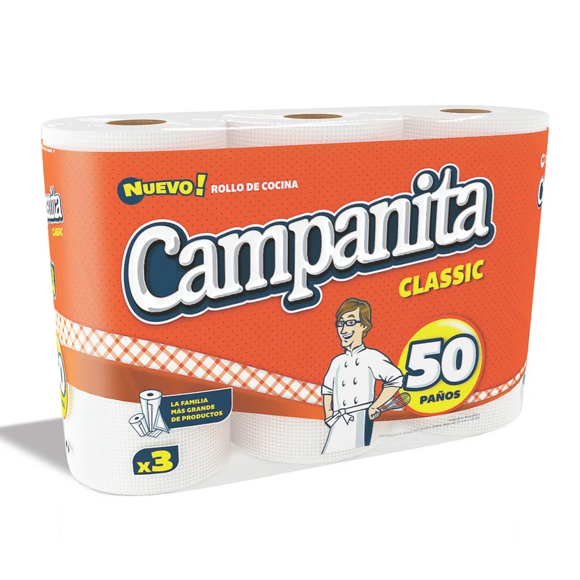 Este producto, de la marca Campanita, es ideal para tu hogar. El formato de toalla es en rollo, con un contenido de 3 rollos de 50 paños cada uno. Su origen es Argentina y son de color blanco.