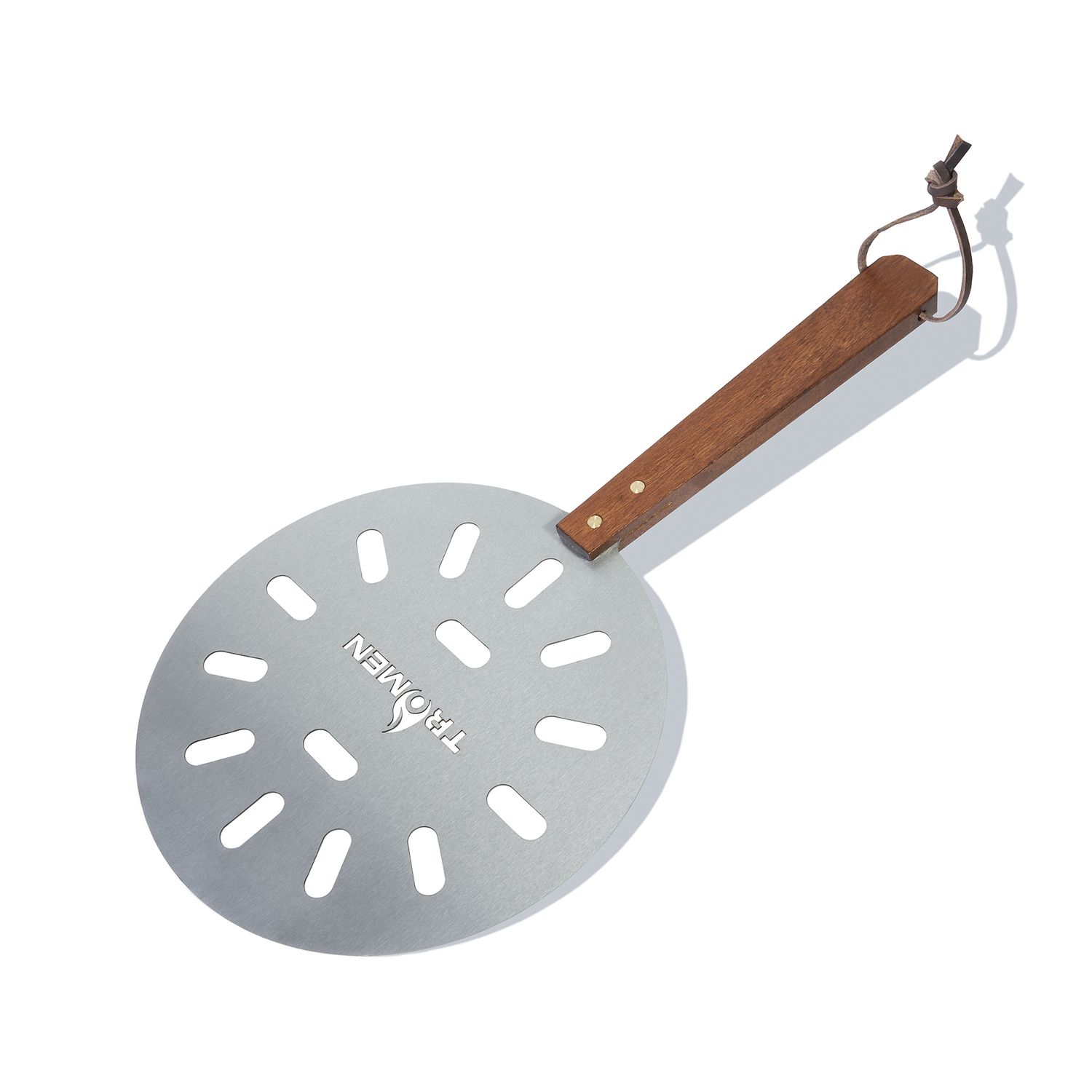 ¡Preparate para ser el maestro pizzero de tus reuniones con la Pala para parrilla redonda Tromen! Con su diseño pensado para la comodidad, esta pala te permitirá manipular tus pizzas con facilidad. Su mango ergonómico de madera y correa de cuero te brindan un agarre seguro y un toque de estilo.