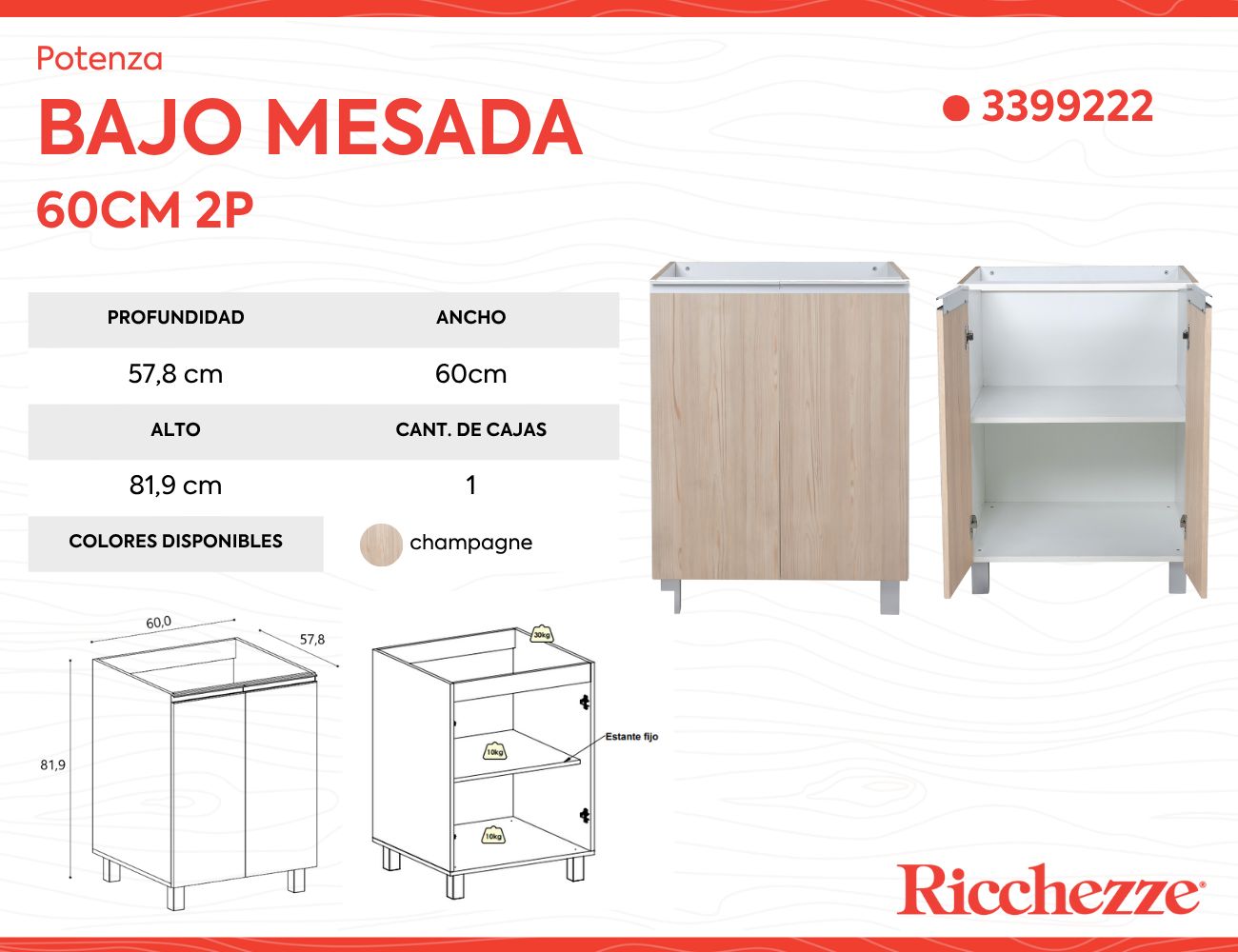 Renová tu cocina con el Bajo mesada Potenza de 60 x 81.9 cm, una pieza clave para un espacio moderno y funcional. Con sus 2 puertas y un elegante color champagne, este bajo mesada Ricchezze te ofrece la combinación perfecta de estilo y practicidad para transformar tu hogar.