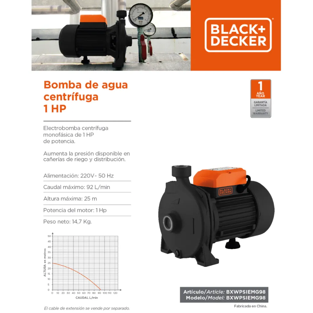 ¡Potenciá tus tareas con la Bomba centrífuga 1HP BLACK+DECKER! Ideal para uso doméstico, esta bomba te ofrece un caudal máximo de 92 l/min y una altura máxima de elevación de 25 m. Perfecta para el jardín, el hogar y mucho más.