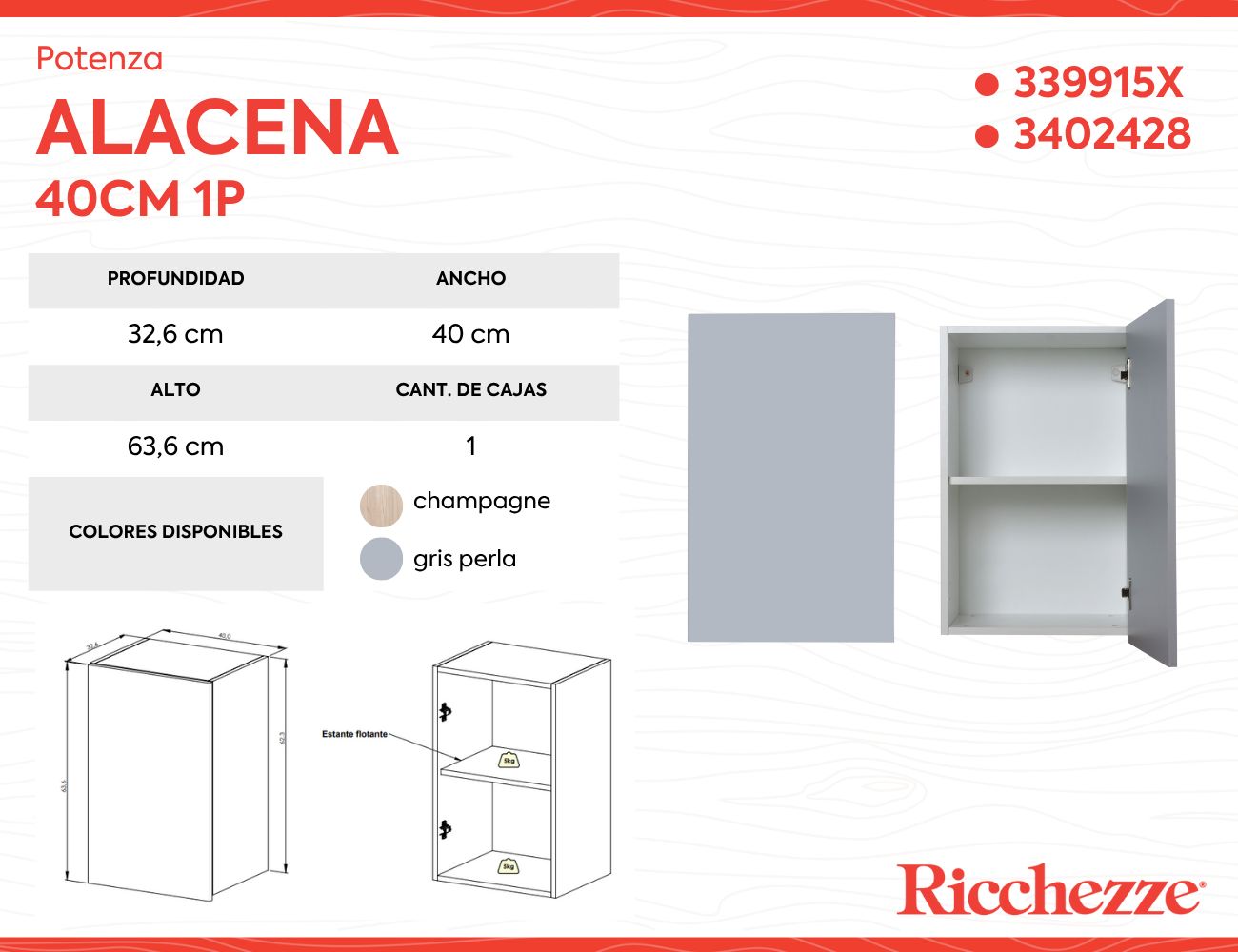 ¡Renová tu cocina con la Alacena Potenza! Con su diseño moderno y versátil, esta alacena de 40 cm de ancho y 63.8 cm de alto, en un elegante color champagne, es perfecta para optimizar el espacio y darle un toque de estilo a tu hogar. ¡No esperes más para transformar tu cocina!