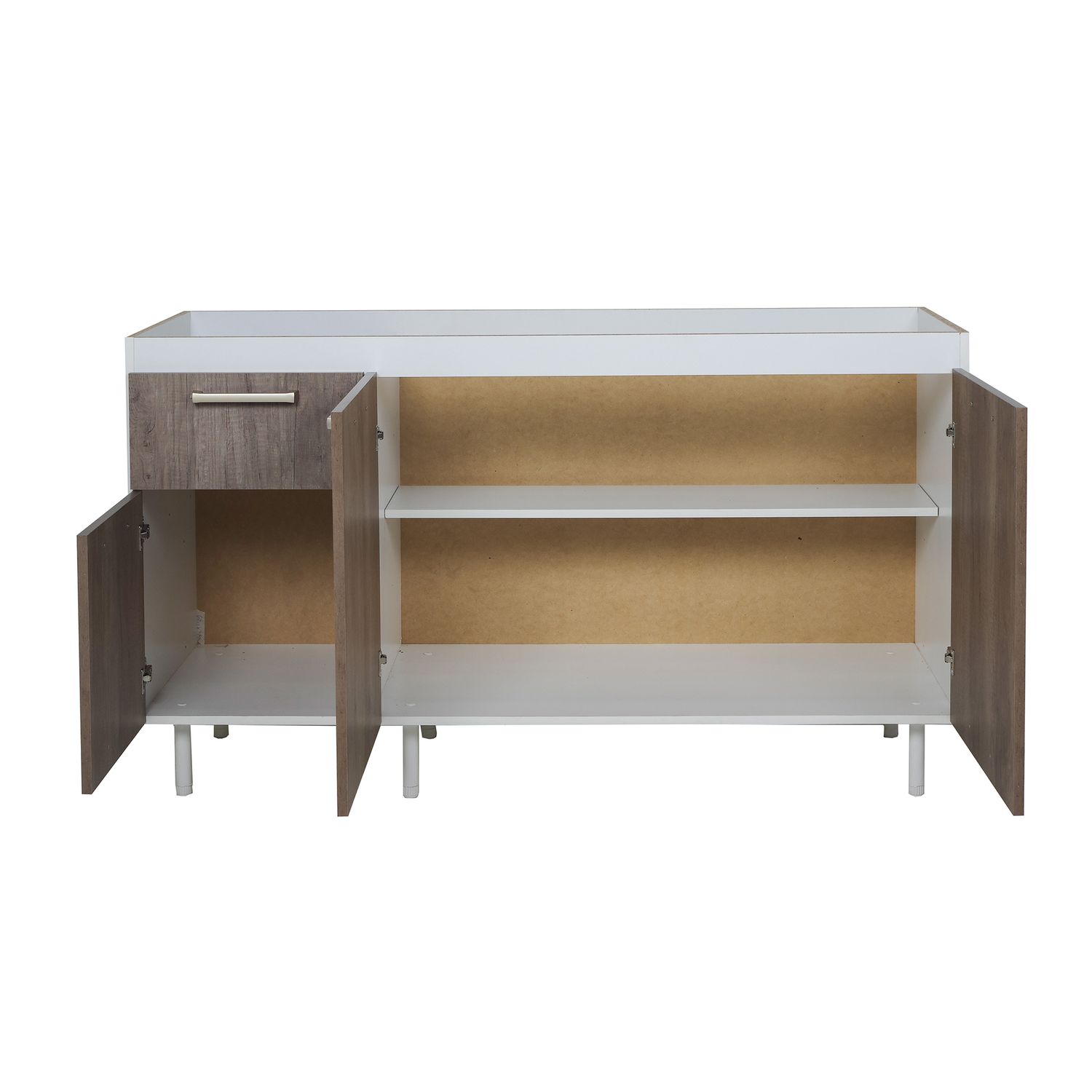Este bajo mesada está construido en melamina de alta calidad con un espesor de 15 mm, garantizando durabilidad y resistencia. Cuenta con 3 puertas y 1 cajón, ambos con tiradores de plástico y correderas metálicas para un deslizamiento suave. Las bisagras son de metal, asegurando un uso prolongado. Además, incluye repisas para optimizar el espacio de guardado y un kit de herrajes e instructivo para un armado sencillo.