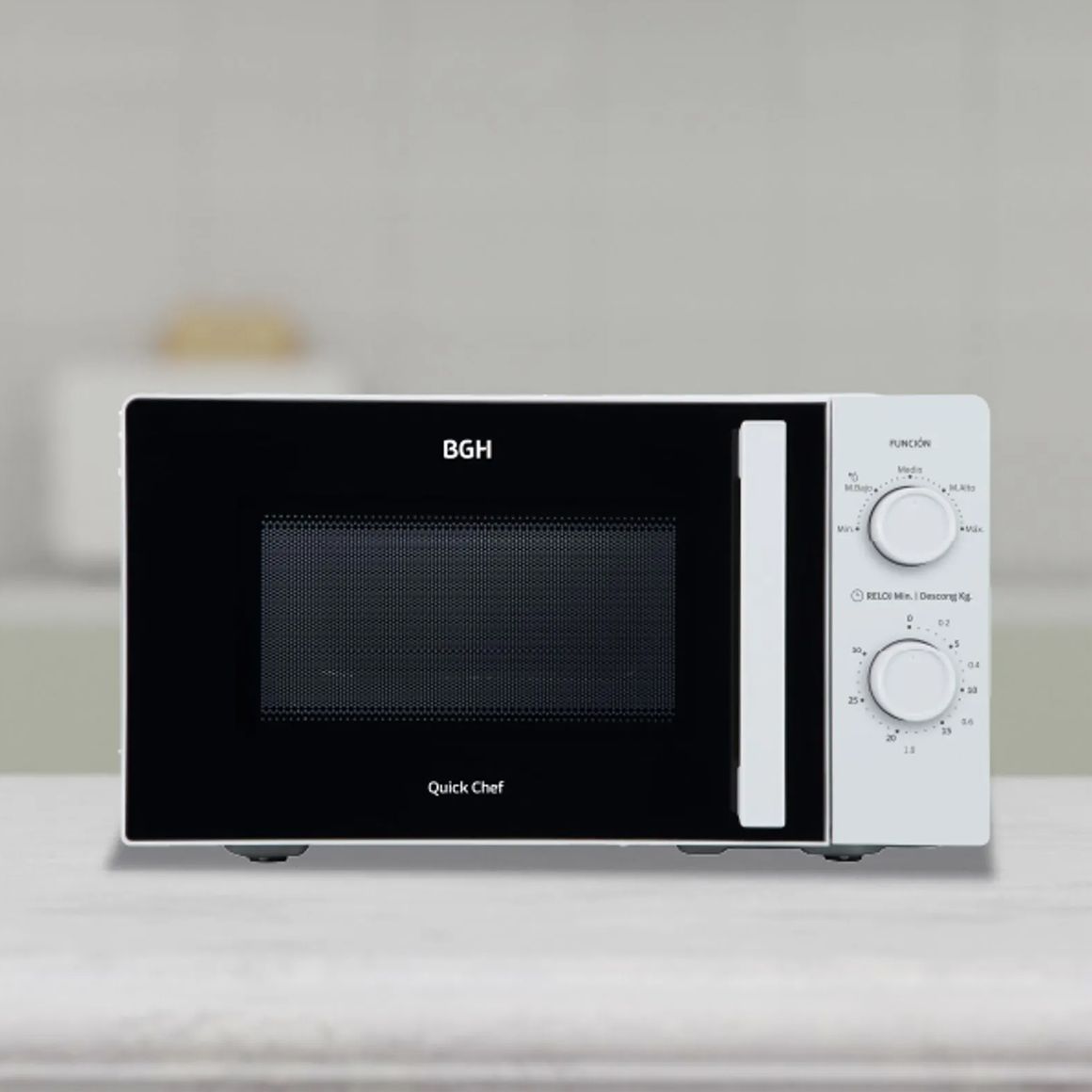 Este microondas BGH cuenta con un panel de control análogo y una potencia de 700 W. Incluye una bandeja de vidrio y ofrece la función de descongelar. Su origen es China.