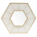 Este espejo tiene un tamaño de 69.5 cm de alto y 80 cm de ancho, con un marco de hierro dorado. Su forma hexagonal le da un toque moderno y original. Es perfecto para colocar en la pared de tu living, ya que le dará un toque de luz y amplitud al espacio.