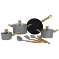 Dale un toque de estilo a tu cocina con este juego de baterías de 11 piezas en color gris. ¡Ideal para preparar tus comidas favoritas con comodidad y elegancia! El juego incluye ollas, cacerolas y un sartén, todos con mangos de madera que le dan un toque sofisticado. No esperes más para renovar tu cocina.