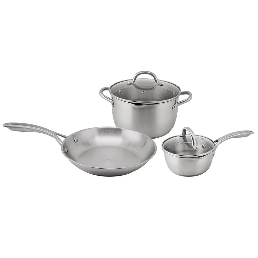 Dale un toque de estilo industrial a tu cocina con este juego de batería de 5 piezas en acero inoxidable plateado. Ideal para preparar tus comidas favoritas, este juego incluye una olla, un cazo, una sartén y dos tapas, todo lo que necesitas para cocinar con comodidad y eficiencia. ¡No esperes más para renovar tu cocina!