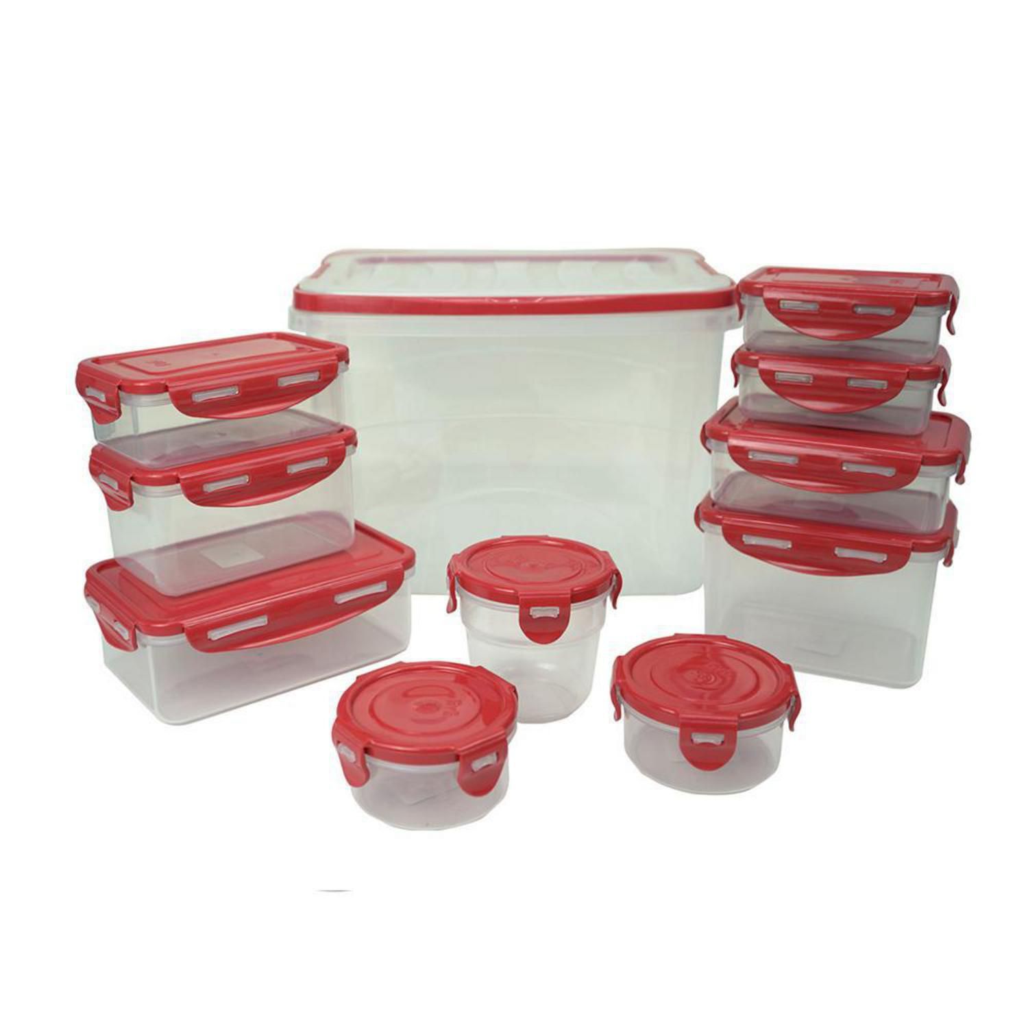 Este set de contenedores de la marca Just Home Collection, está fabricado en plástico resistente y ofrece una capacidad volumétrica de 12000 ml. Incluye contenedores de diferentes formas: redondos, cuadrados y rectangulares, para adaptarse a tus necesidades. El color transparente y rojo de los contenedores te permite visualizar el contenido, mientras que su diseño con tapas asegura la frescura de tus alimentos.