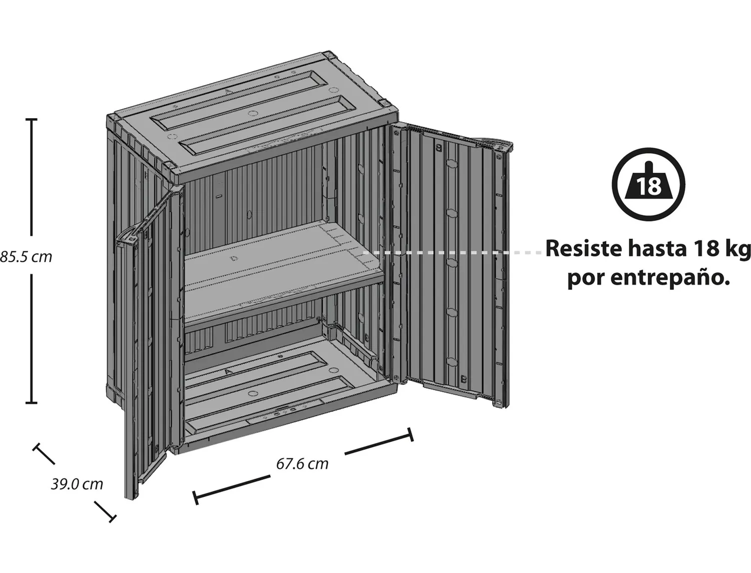 Fabricado en polipropileno de alta resistencia, este armario incluye un entrepaño ajustable con capacidad de hasta 18 kg (carga uniformemente distribuida), ofreciendo versatilidad para almacenar objetos de diferentes tamaños. Además, cuenta con protección UV para mantener su color intacto y manijas horizontales para un fácil acceso. Para mayor seguridad, posee un orificio para colocar un candado.
