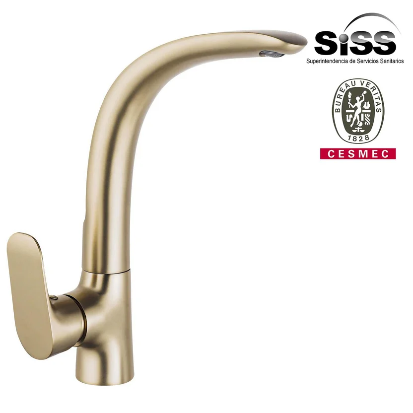 Dale un toque de elegancia a tu cocina con la Grifería monocomando Gold Vittorio. Este grifo de diseño vertical y color dorado cepillado, de la línea Vittorio, es perfecto para tu lavaplatos. ¡Renová tu espacio con estilo y funcionalidad!