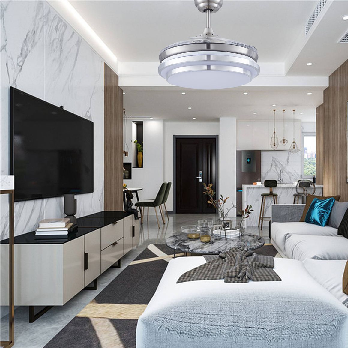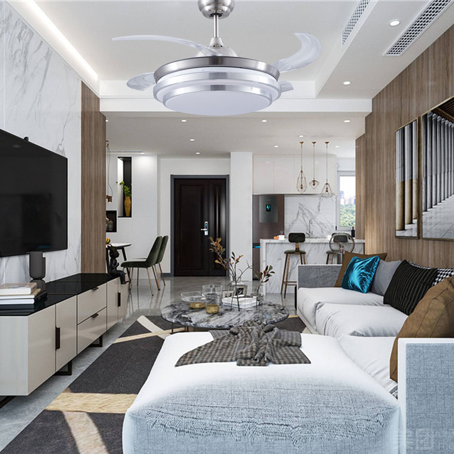 Este ventilador de techo cuenta con un motor reversible y 5 velocidades para que puedas ajustar la intensidad del flujo de aire según tus necesidades. Su potencia máxima es de 20 W y funciona con control remoto. Está fabricado con acero y aspas de PC plástico, lo que garantiza durabilidad y resistencia. Es ideal para dormitorios, interiores, cocinas, living, oficinas, otros, salas y comedores.