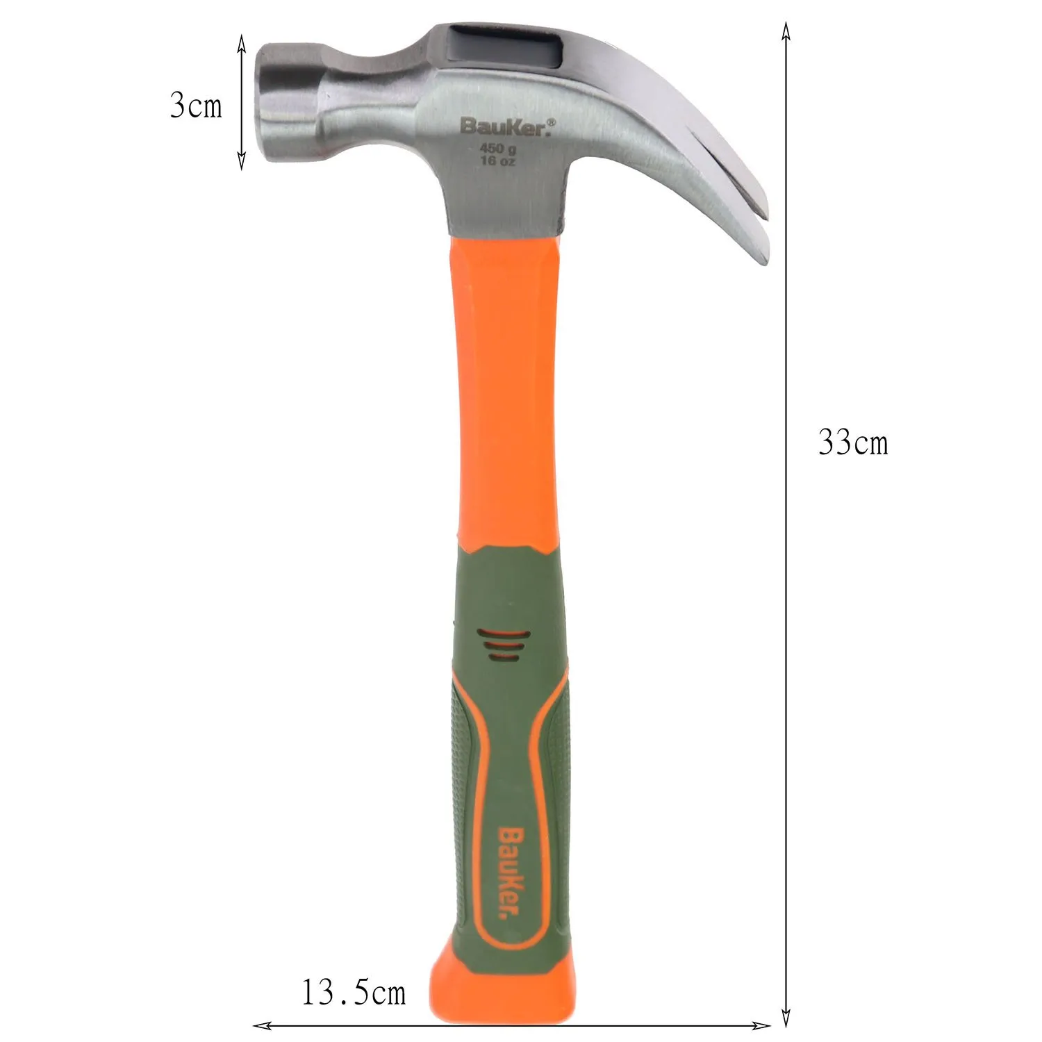 Este martillo carpintero Bauker, con su cabeza de acero y tipo de uña, está diseñado para trabajos pesados. Con un largo de 33.5 cm y un ancho de 13 cm, ofrece un agarre cómodo y eficiente. Su origen es China y cuenta con un mango de fibra de vidrio.