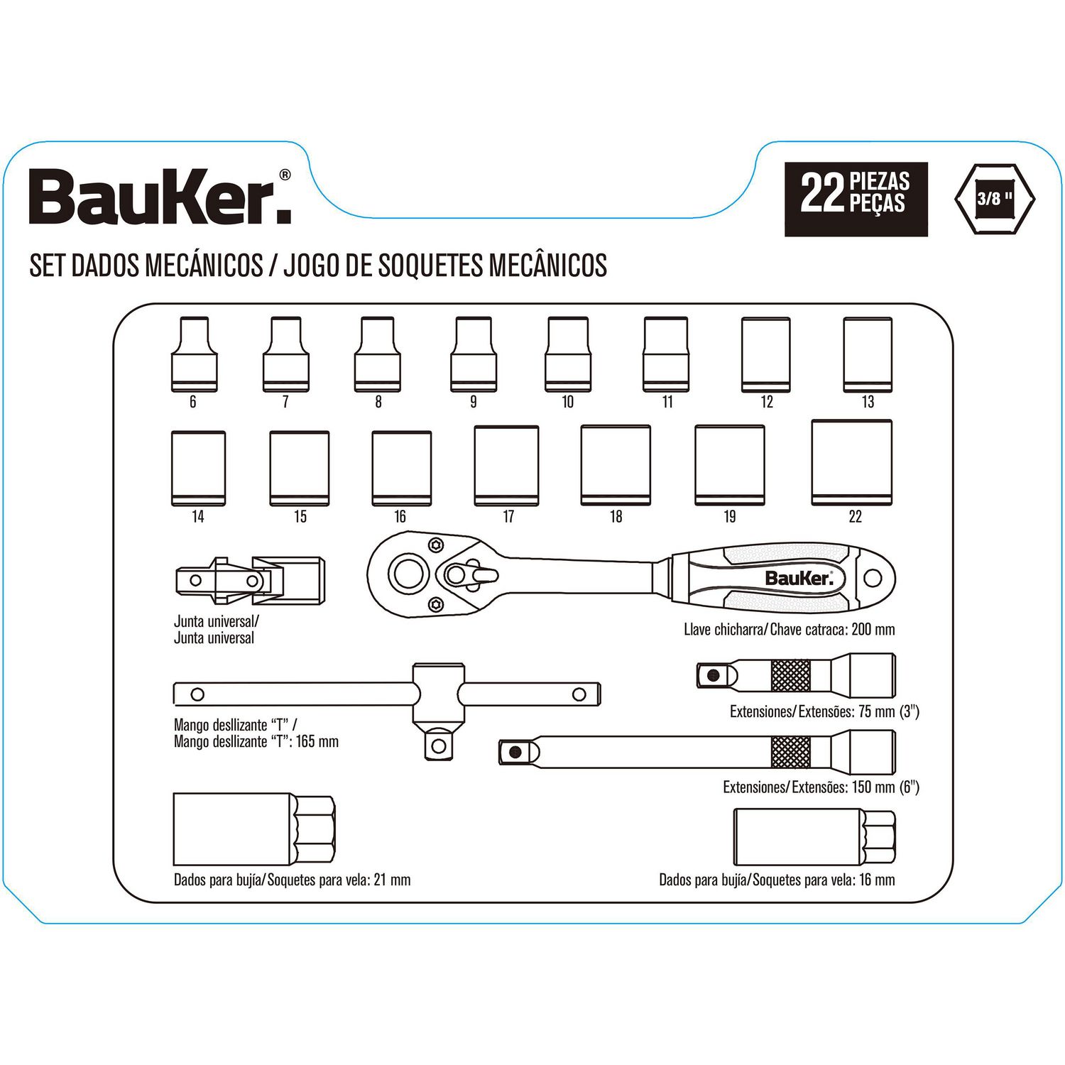 Este kit de herramientas Bauker está fabricado en acero, lo que garantiza su durabilidad y resistencia. Incluye 22 piezas esenciales para tus tareas de mecánica. Con un largo de 7 cm, un ancho de 32 cm y un alto de 28 cm, este set es compacto y fácil de almacenar. El origen del producto es China.