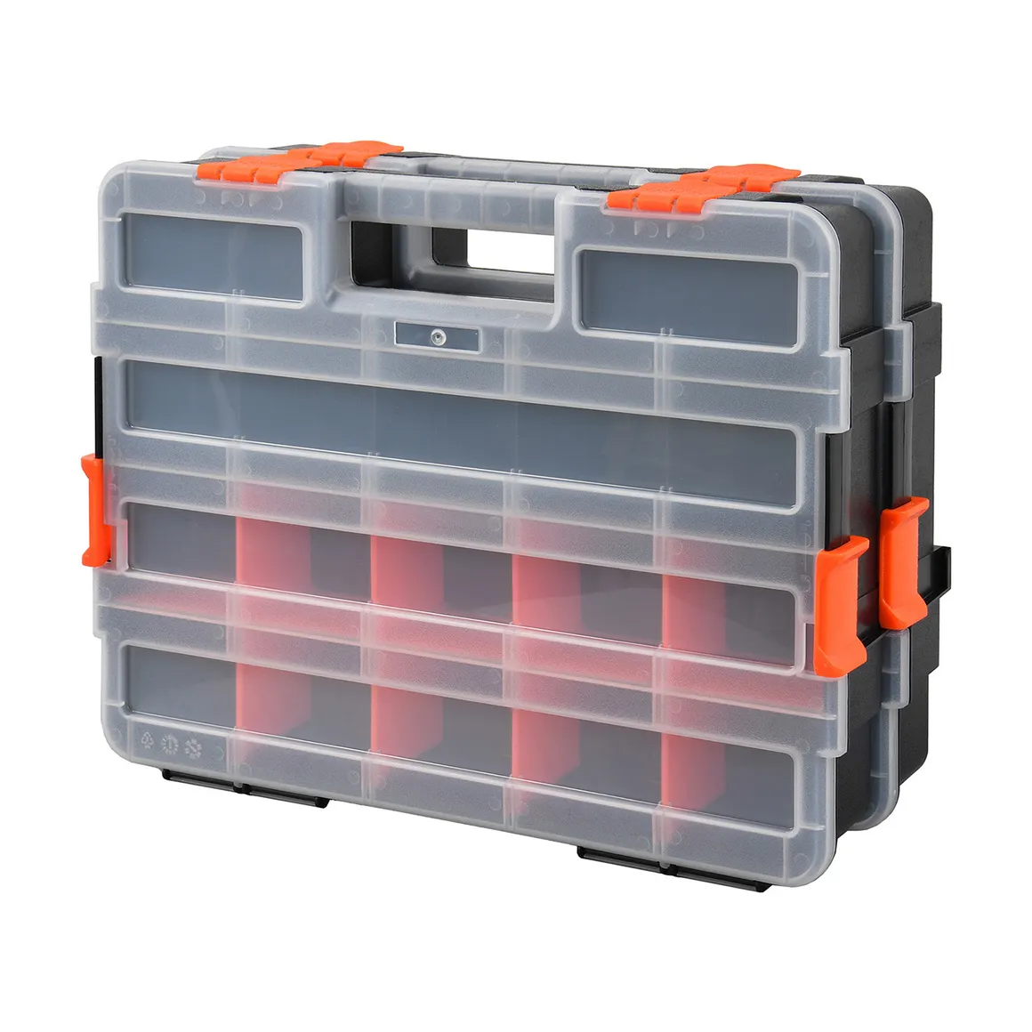 ¡Organiza tus herramientas con el Organizador de herramientas de 2 niveles! Este práctico organizador, con cierre de hebilla y manillas plásticas, es perfecto para mantener tus herramientas ordenadas y listas para usar. Su diseño en color negro y material de plástico y metal lo hacen resistente y duradero, ideal para cualquier taller o espacio de trabajo.
