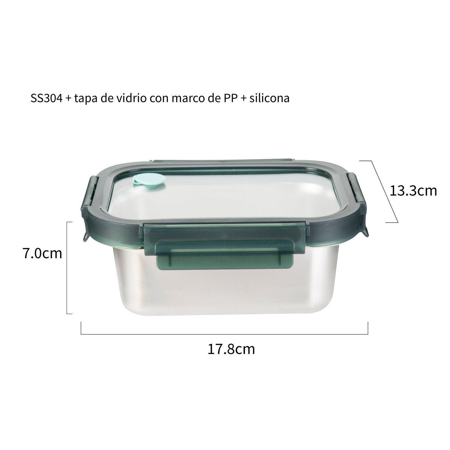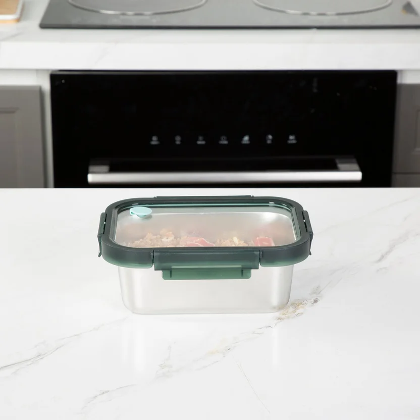 Este contenedor incluye una tapa y es ideal para mantener tus alimentos frescos gracias a sus características herméticas. Está fabricado en acero inoxidable, lo que garantiza su durabilidad. Con una capacidad de 800 ml, es perfecto para porciones individuales. Sus dimensiones son de 7.5 x 13.3 x 18.5 cm, lo que lo hace fácil de almacenar y transportar. El modelo es IQSS800RC-GN y cuenta con un estilo ejecutivo.